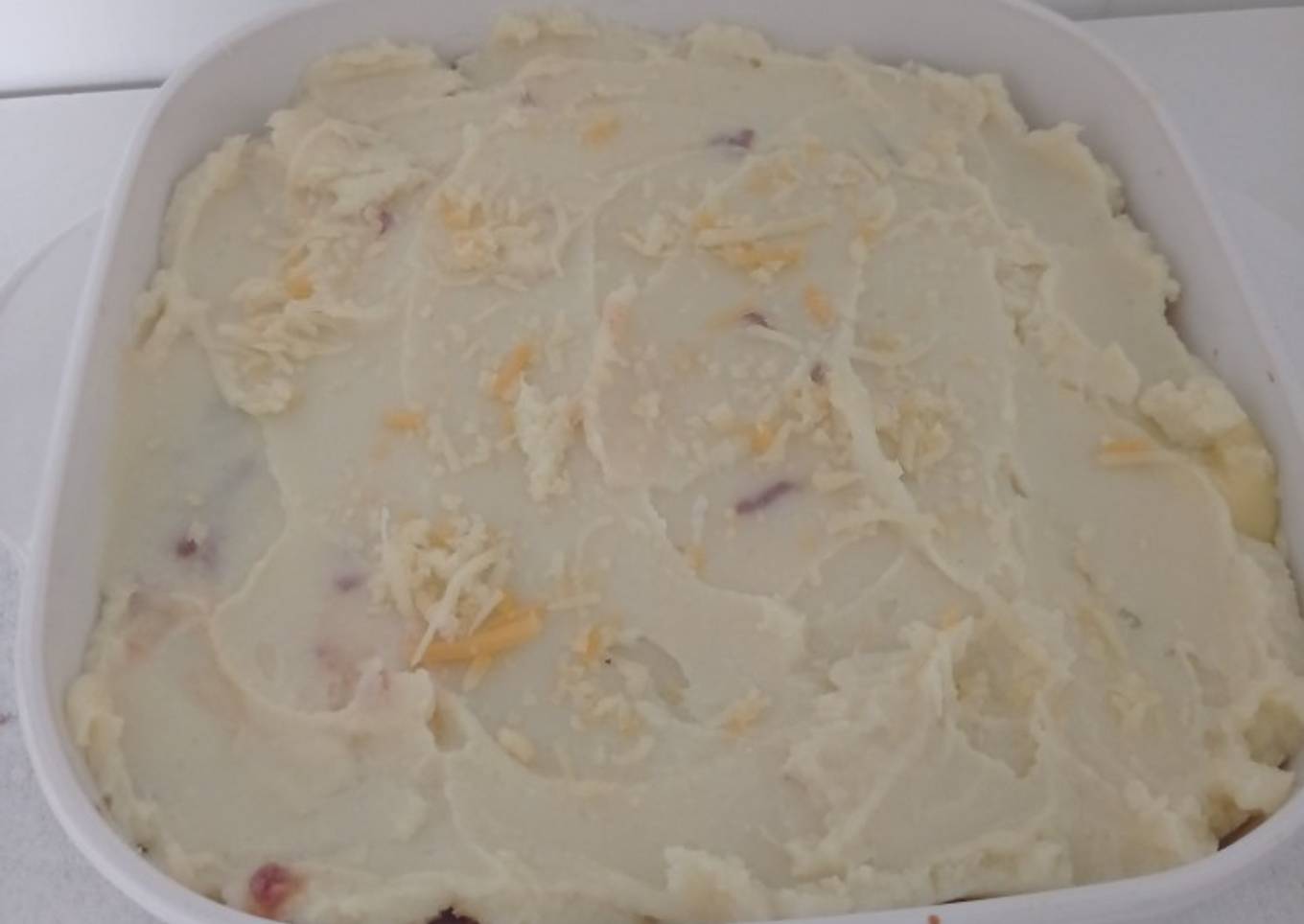 - Se pone en una fuente para el horno y se le echa el puré de patata, con un poco de queso rallado por encima