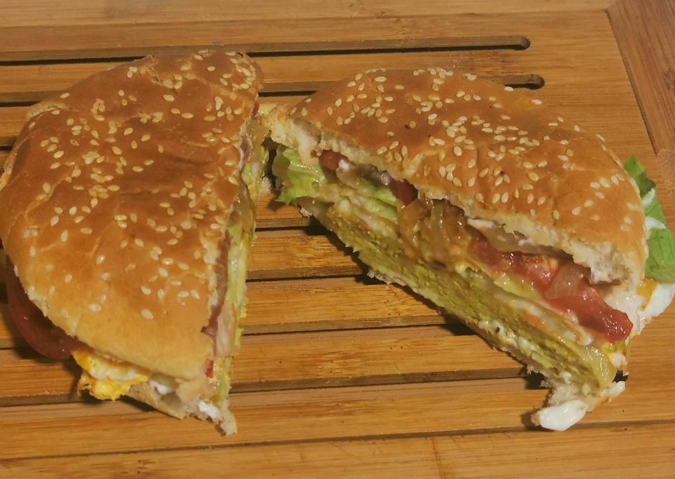 Salsa en el pan, hamburguesa, queso, huevo, lechuga, tomate, cebolla caramelizada.