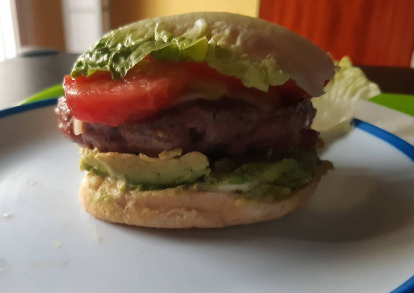 - Una vez que la carne está cocinada,en la última vuelta le ponemos el queso,que se funda con el calor de la sartén. Sacar y montar sobre el aguacate, luego poner rodajas de tomate y trozos de lechuga al gusto. Y cerramos la hamburguesa.