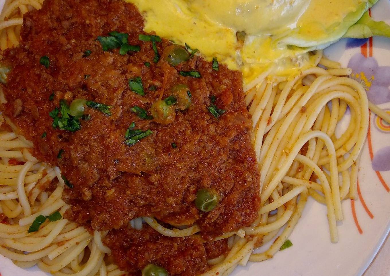 Tallarines en salsa de carne molida y papa a la huancaina