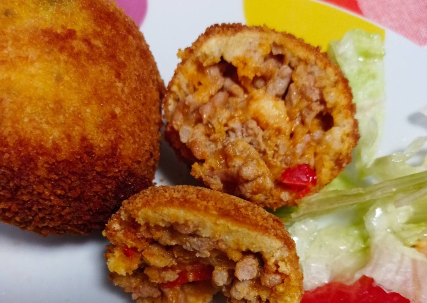 A estas albóndigas las hice con boloñesa que me sobró cuando preparé las bombas o bolas de arroz (Arancini di riso a mi manera) que podrán encontrar en mi recetario. Aunque sea boloñesa sobrante de otra receta igual les indicaré cómo prepararla. Para hacer estas albóndigas es necesario separar la carne de la salsa, por lo que a dicha salsa se la puede aprovechar para acompañar arroz o fideos.