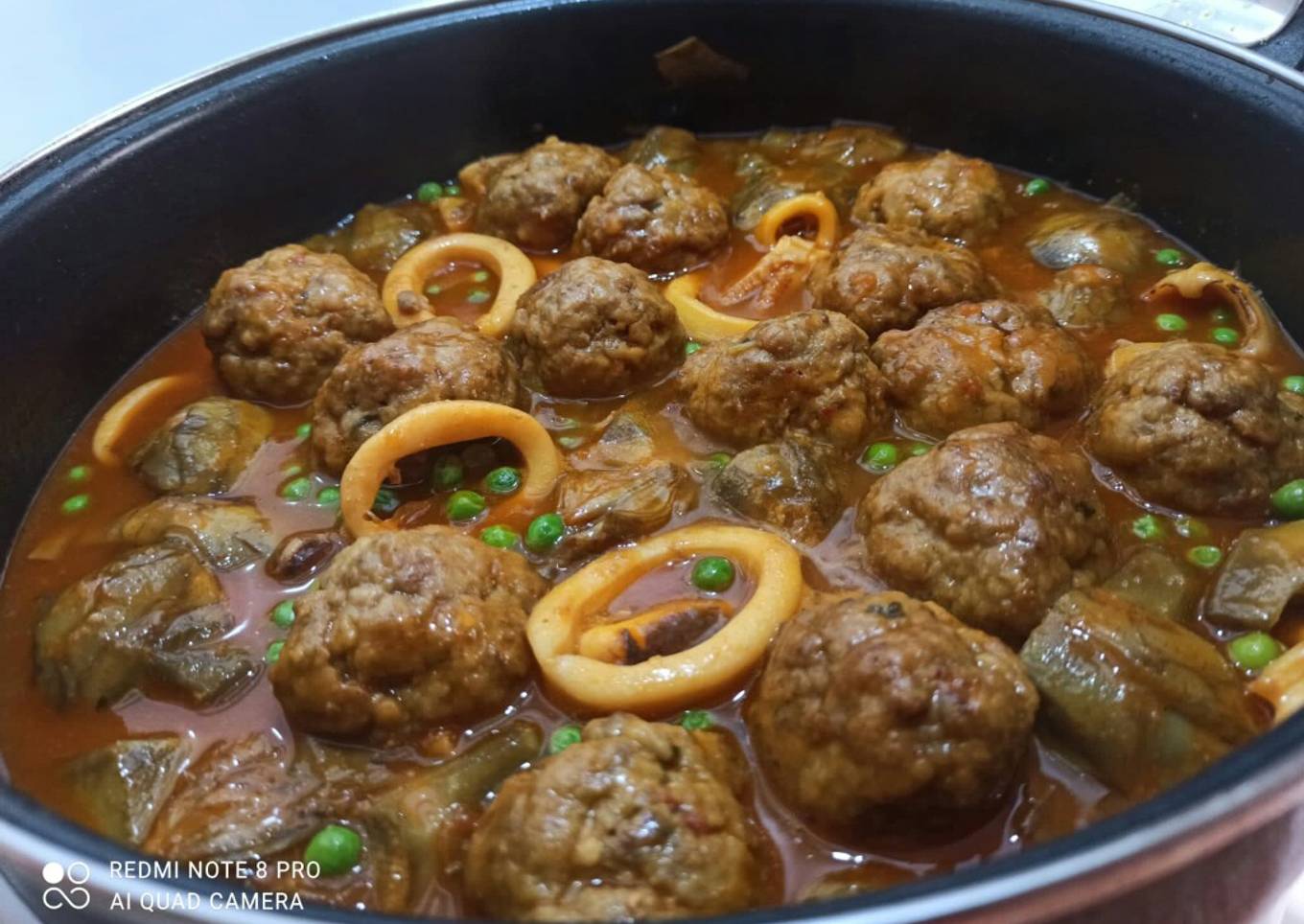Hello everybody, hope you are having an amazing day today. Today, I'm gonna show you how to make a distinctive dish, Guiso de albóndigas con calamar y alcachofas. It is one of my favorites. This time, I'm gonna make it a little bit tasty. This will be really delicious.