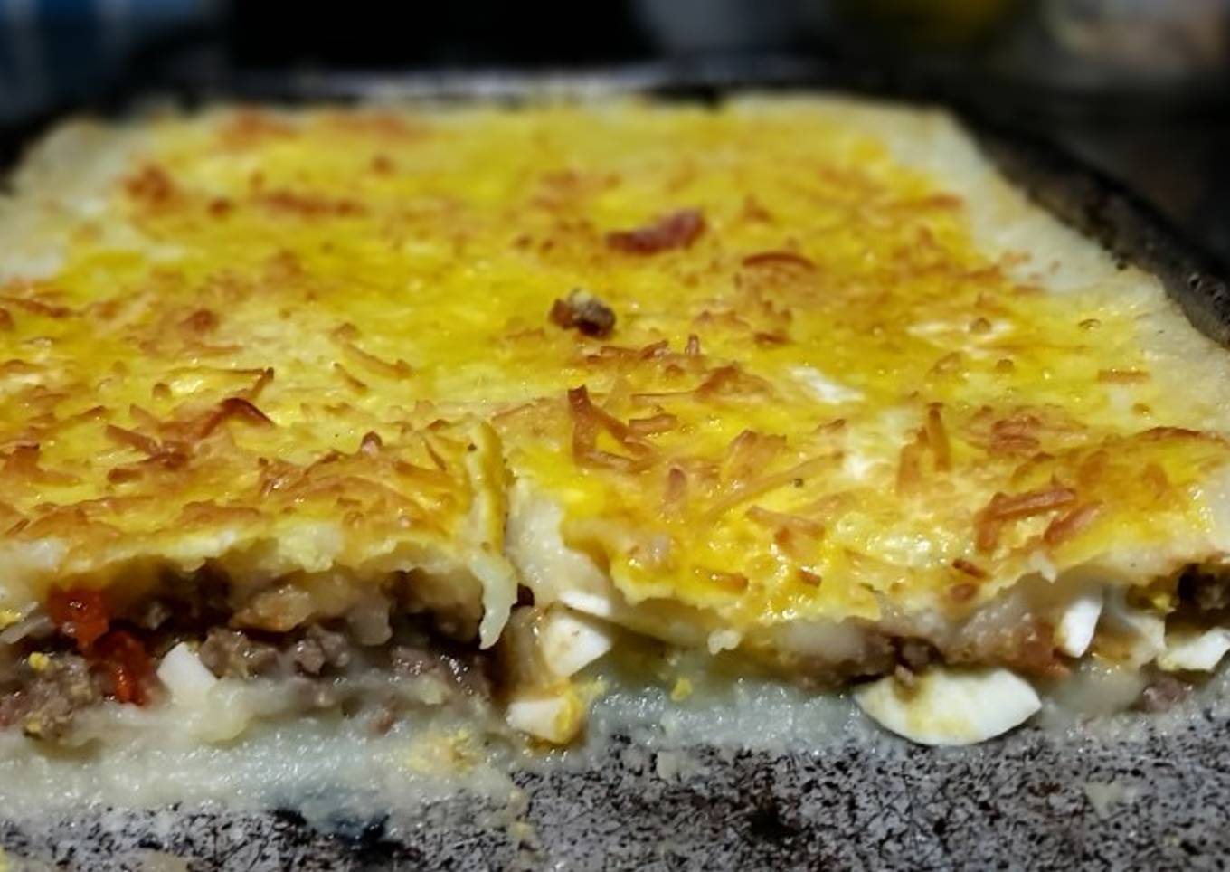 - En una asadera aceitada colocar la mitad del puré, luego el preparado de la carne y nuevamente puré. Batir un huevo pintar el pastel y colocar queso rallado encima, llevar unos minutos al horno.. Buen Provecho 👍