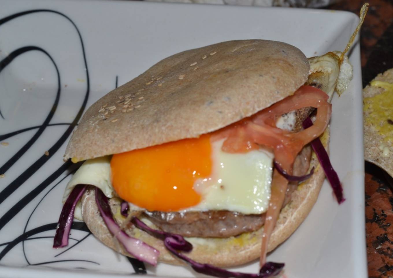 - Seleccionamos el pan, como veran recién salidos del horno, la verdura la salamos y ponemos un chorrito de aceite de oliva saborizado con albahaca y un chorrito de limón, cortamos por la mitad, untamos un poco de limón, mayonesa y savora, colocamos la hamburguesa, sobre la misma el tomate, el repollo y el huevo frito salamos, tapamos y listo