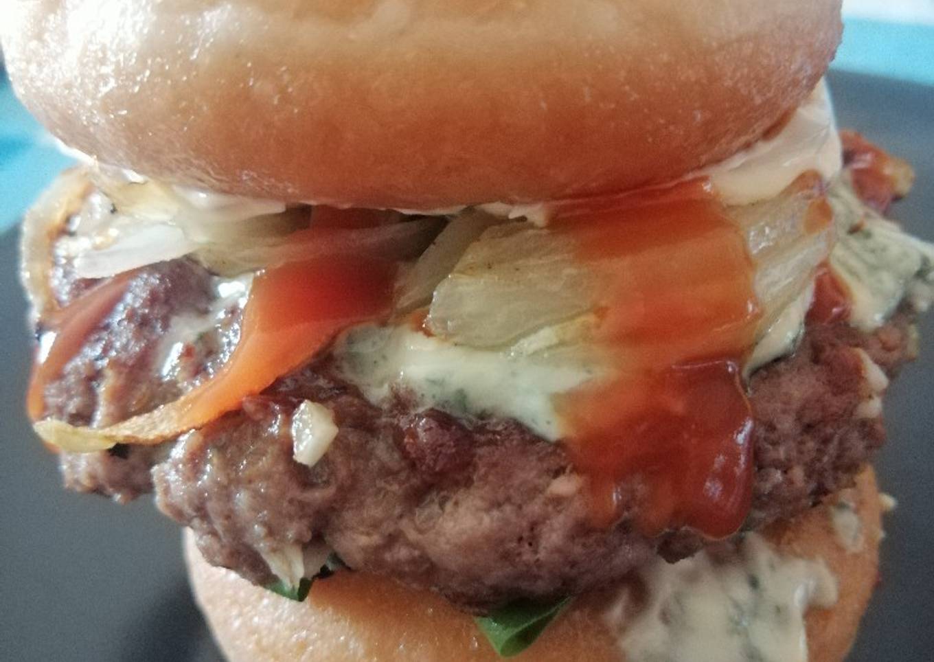 - Picar bien pequeños los ajos y mezclar con la carne. Formar la hamburguesa y a la parrilla o sartén. Picar la cebolla en juliana y la salteamos junto con la hamburguesa