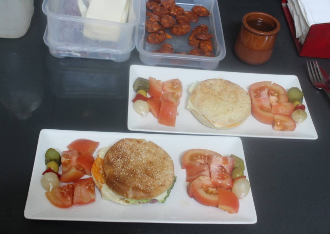 Steps to make to make Hamburguesa con doble de tomate y banderillas