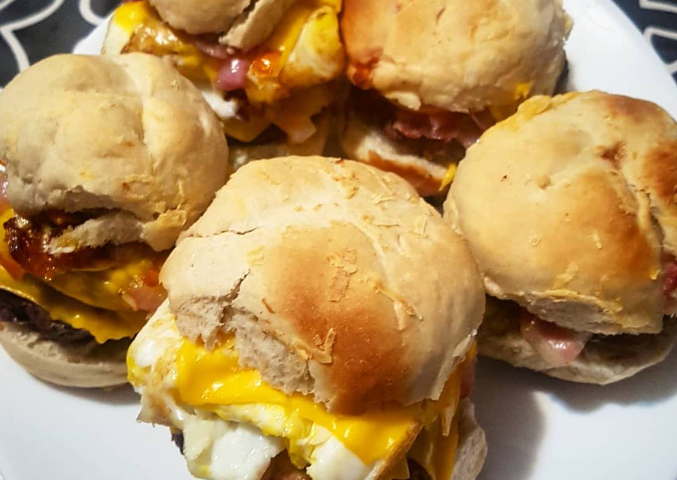 - Corta un pan, arma las hamburguesas con cheddar, la preparación salteada, más cheddar, panceta y el huevo encima.