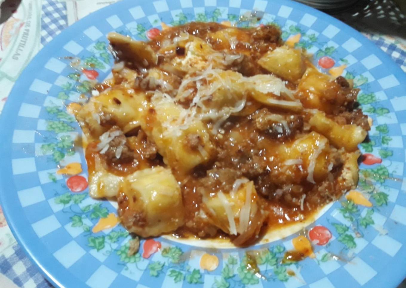 Nota: el relleno es fácil se pisa la ricota junto con todos los ingredientes de relleno y listo. - El tuco es fácil también: se sofríe la cebolla con 1 cdita de sal y cuando van blanqueando se agrega 1 cdita de azúcar. Una vez cocidas se agrega el morrón brunoise y la carne picada. Poner el fuego bien bajo. Tapar e ir revolviendo cada 3 minutosby cuando ya está cocida condimentar a gusto, colocar el puré de tomates. Tapar de nuevo cocinar 5 minutos y agregar 1/2 taza de agua y cocinar 15 minutos más. Listo dejar reposar.