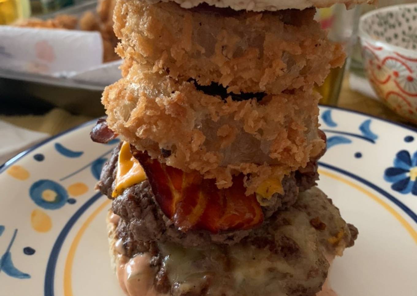 - Sirva las hamburguesas agregando salsa barbecue al pan, agregue 2 anillos de cebolla, ponga 2 hamburguesas con el queso y sirve