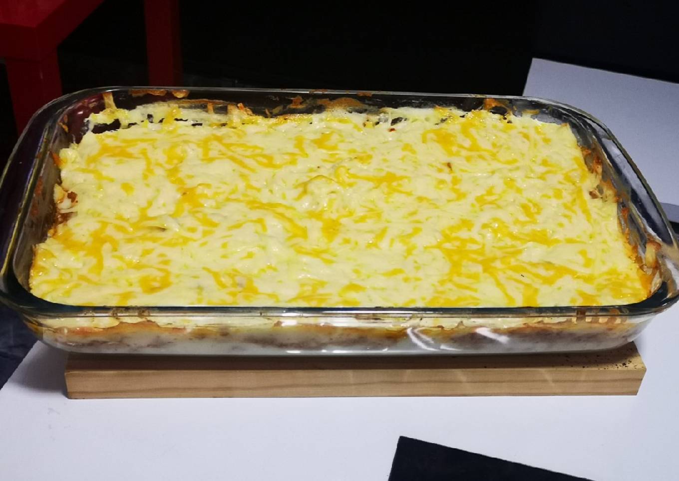 - Ahora ponemos una capa de puré de patatas en la bandeja, le añadimos la carne encima haciendo, le añadimos los Tranchetes encima, ponemos otra capa de puré de patatas y encima lo cubrimos de queso(yo le echo 4 quesos).