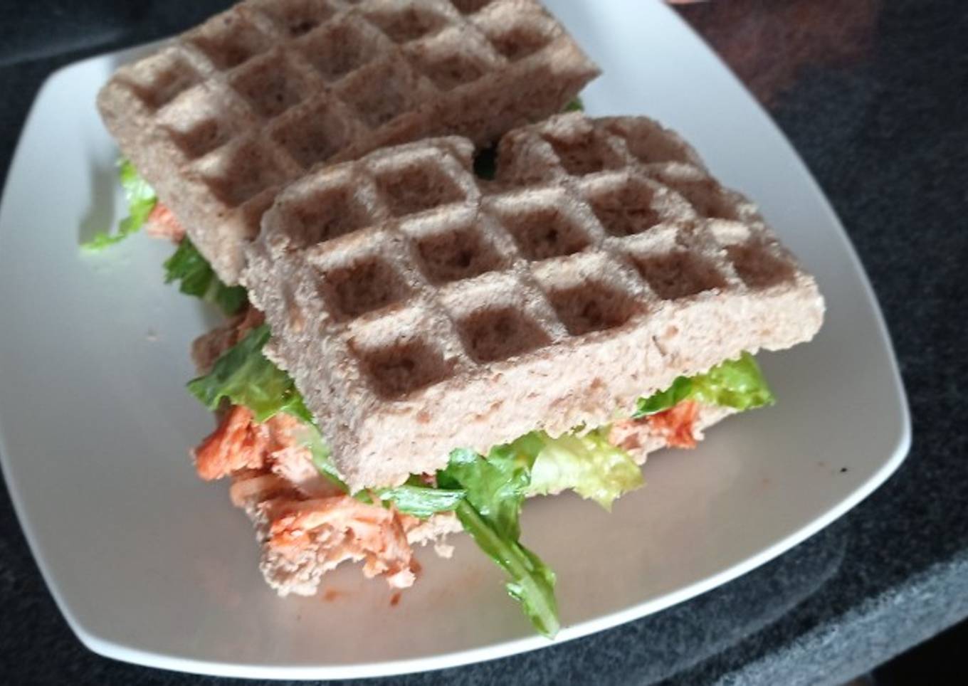 - Saca los waffles del horno, coloca la lechuga, el tomate y la milanesa desmenuzada... Disfruta.